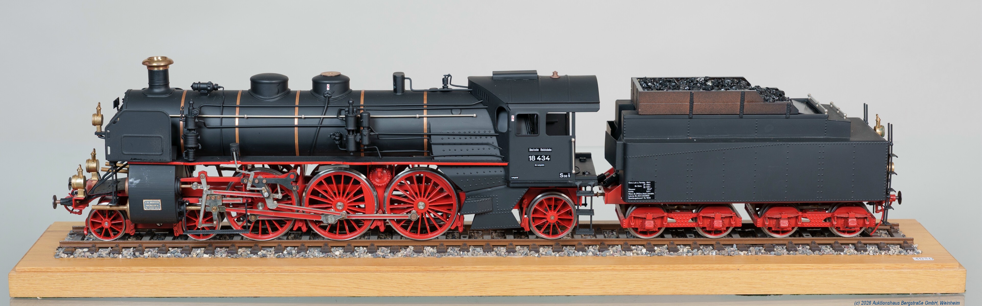 | 4015 | Tax: 920,- | 1 Schweizer Kleinserien-Dampflokomotive mit 4-achs. Tender Spur 1, schwere Metallausführung, Deutsche Reichsbahn Gesellschaft, Epoche II, Betriebsnummer: 18.434, Achsfolge: 2'C'1, messingfarbene Loklaternen, kupferne Kesselringe, Messing-Schlotkranz, Bremsschläuche, Federpuffer, Vorbildkupplungen, schwarz/rot, sehr guter Zustand, Präsentationssockel mit eingeschottertem Gleis und Plexiglashaube, nur an Selbstabholer! | |