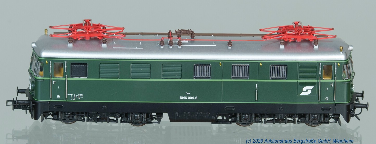 | 2005 | Tax: 58,- | 1 Rivarossi Elektrolokomotive HR2585, Baureihe: 1046, ÖBB, Epoche IV, Betriebsnummer: 1046.004-6, Achsfolge: 'Bo''Bo', dunkelgrün mit hellgrünen Zierlinien, Dach: silberfarben, neuwertiger Zustand, Originalkarton! | |