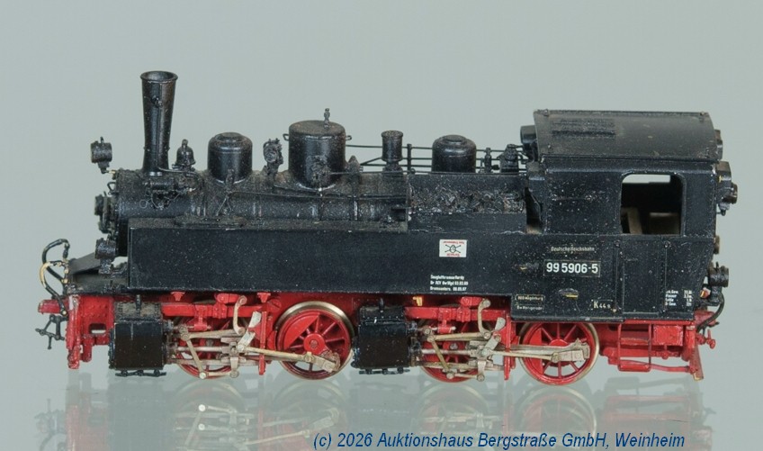 | 2052 | Tax: 110,- | 1 Weinert H0m Schmalspur Tenderlokomotive 6227, Deutsche Reichsbahn, Epoche IV, Betriebsnummer: 99.5906-5, Achsfolge: 'B''B', schwarz/rot, Bw Wernigerode, Metallausführung, leichte Gebrauchsspuren, noch guter Zustand, Originalkarton! | |