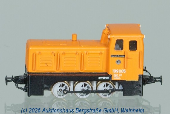 | 2053 | Tax: 130,- | 1 Heinrich Präzisionsmodellbau H0m Schmalspur Diesellokomotive, Deutsche Reichsbahn, Epoche IV, Betriebsnummer: 199.005, Achsfolge: 'C', orangefarben/schwarz, Räder: grau, Bw Wernigerode, neuwertiger Zustand, Originalkarton! | |