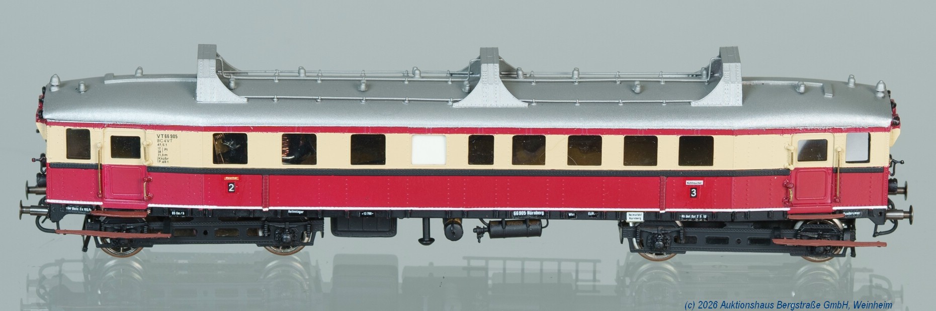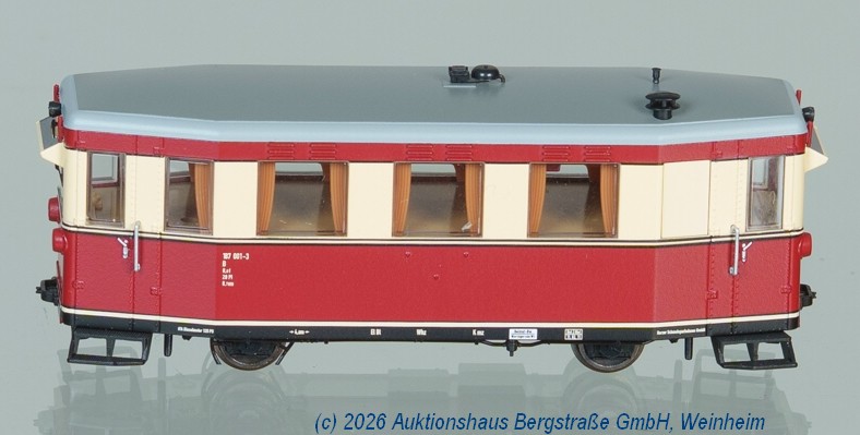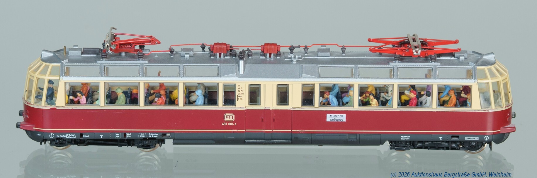 | 2071 | Tax: 38,- | 1 Lima Elektrischer Triebwagen 149800.GP, 'Eierkopf', Deutsche Bundesbahn, Epoche IV, Betriebsnummern: 430.118-0, 830.018-8 und 430.418-4, 1. und 2. Klasse, 3-teilig, Gesamtlänge: ca. 93 cm, Gehäuse: weinrot, Dach: grau, guter Zustand, Unterteil des Originalkartons! | |