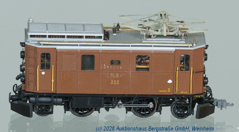 | 2063 | Tax: 46,- | 1 Bemo H0m Elektrolokomotive 1256122, Baureihe: Ge 2/4, Rhätische Bahn, Betriebsnummer: 221, Achsfolge: 1'B'1, Länge: ca. 10 cm, Gehäuse: braun, Dach: silber, unbedeutende Gebrauchsspuren, noch guter Zustand, Originalkarton! | |