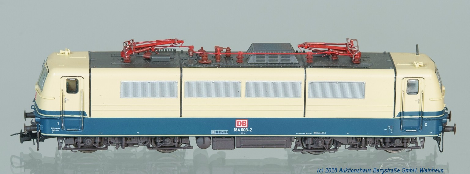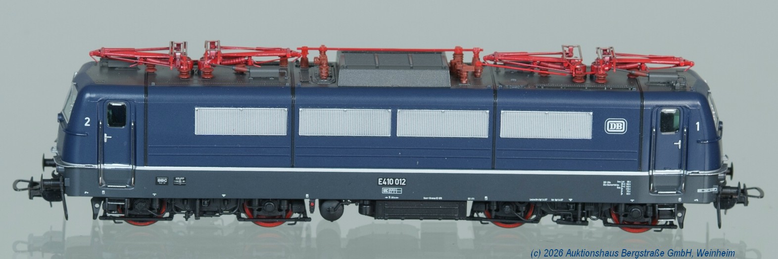 | 2008 | Tax: 36,- | 1 Liliput 'Rheingold'-Elektrolokomotive 714102, Baureihe: E 10, Deutsche Bundesbahn, Epoche III, Betriebsnummer: E 10.1242, Achsfolge: 'B''B', Länge: ca. 18,8 cm, Gehäuse: creme/blau, Dach: silber, Zurüstsatz liegt bei, sehr guter Zustand, Originalkarton! | |