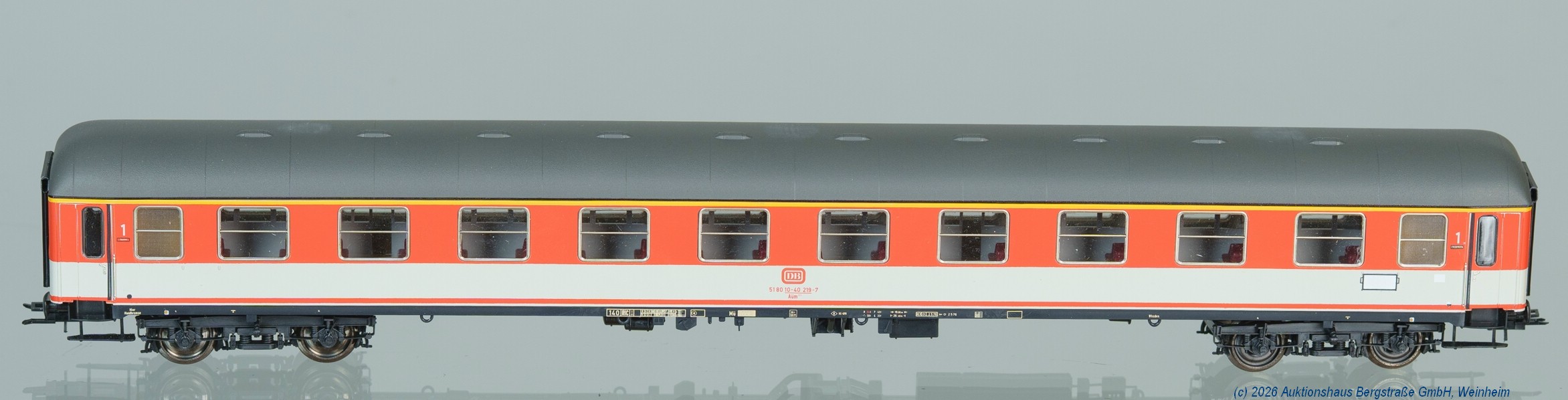| 2075 | Tax: 34,- | 1 Konvolut Roco: 4 IR-Schnellzugwagen, Deutsche Bundesbahn, Epoche IV-V, 1 Wagen 45080, 1.Klasse und 3 Wagen 44034, 2.Klasse, alle grauweiß mit blauem Fensterband, himbeerfarbenes, neues 'DB'-Emblem, Länge: ca. 27 cm, guter Zustand, 4 Originalkartons(einer falsch)! | |