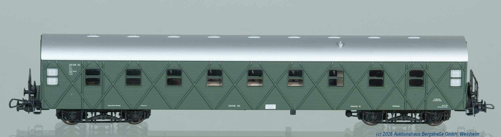 | 2973 | Tax: 48,- | 1 Konvolut Heris: 2 Lazarettzugwagen, 4-achs., Bauart: Mc4i, Deutsche Reichsbahn, Epoche II, 1 Wagen 11210-1, Wagennummer: 320.027 Bln und 1 Wagen 11210-2, Wagennummer: 320.047 Bln, beide dunkelgrau, matt, neuwertig, Originalkartons! | |