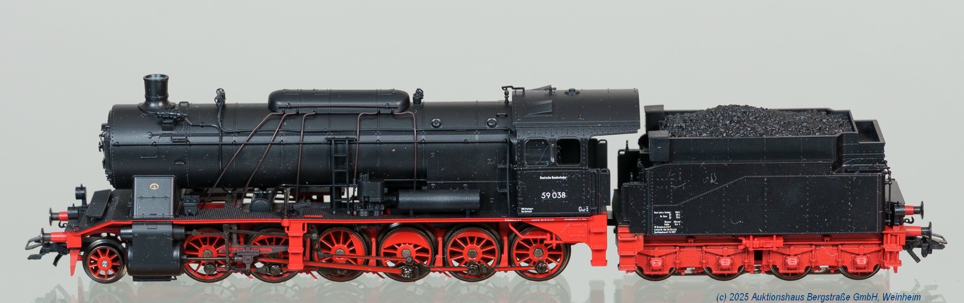 1035 | Tax: 170,- | 1 Märklin digital Dampflokomotive mit 4-achs. Tender 37058, Baureihe: 59, Deutsche Bundesbahn, Epoche III, Betriebsnummer: 59.038, Achsfolge: 1'F, Länge: ca. 23,2 cm, Gehäuse: schwarz/rot, sehr guter Zustand, Originalkarton | |