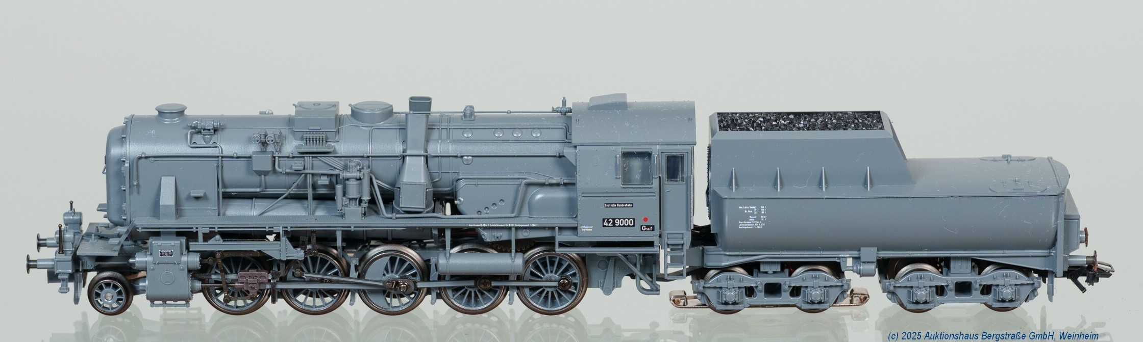 1038 | Tax: 74,- | 1 Märklin digital Dampflokomotive mit 4-achs. Wannentender 39160, Baureihe: 42.90, Bauart: 'Franco Crosti', Deutsche Bundesbahn, Epoche III, Betriebsnummer: 42.9000, Achsfolge: 1'E', Länge: ca. 26,4 cm, Gehäuse: grau, Insider-Modell, neuwertiger Zustand, Originalkarton! | |