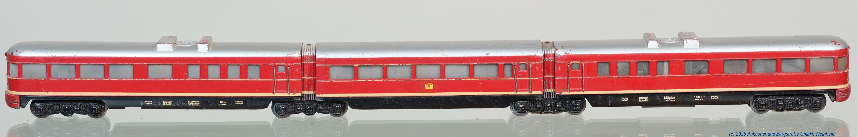 1504 | Tax: 390,- | 1 Märklin dreiteiliger Schnelltriebwagen 3025, Deutsche Bundesbahn, Epoche III, 8-achs., Gesamtlänge: 56 cm, Gehäuse: rot mit cremefarbenen Längsstreifen, Dach: silber, Fenster mit Cellon hinterlegt, drei elektrische Stirnlampen an jeder Front, Bauzeit: ca. 1958-1961, Rahmenbeschriftung sehr gut, guter Originalzustand, verschmutzter, hellblauer Originalkarton! | |