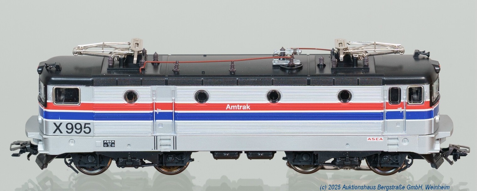 1509 | Tax: 150,- | 1 Märklin digital ICE-Triebwagenzug 3700, 'Amtrak', Inter-City-Express Baureihe 401 der Deutschen Bundesbahn als Demonstrationszug für die USA, achtteilig, ICE TRAIN AMTRAK NORTH AMERICA TOUR '93, 1. und 2. Klasse, Gehäuse: grauweiß mit himbeerrot/violetten Streifen, schwarze Aufschrift: 'Amtrak - ICE', zwei Triebköpfe, sechs Zwischenwagen mit Inneneinrichtung und Innenbeleuchtung, Bauzeit: 1994, limitiert, neuwertig, Originalkarton mit Zertifikat Nr.004836! | |