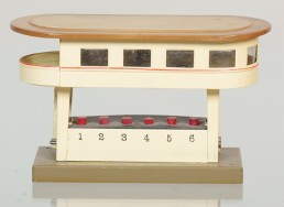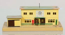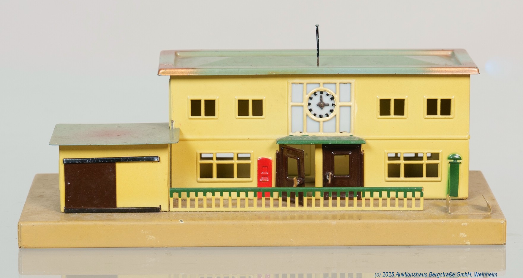 1536 | Tax: 40,- | 1 Märklin Lokomotivschuppen für Elektrolokomotiven 7029, Blechausführung, 2-ständig, Wände: hellbeige, Dach: grau schattiert, Fenster und Türen: blau, Anlage: 33 x 18 x 15 cm, mit Fahrleitung, Bauzeit: 1952-1961, Türmechanik funktionsfähig, noch guter Originalzustand! | |