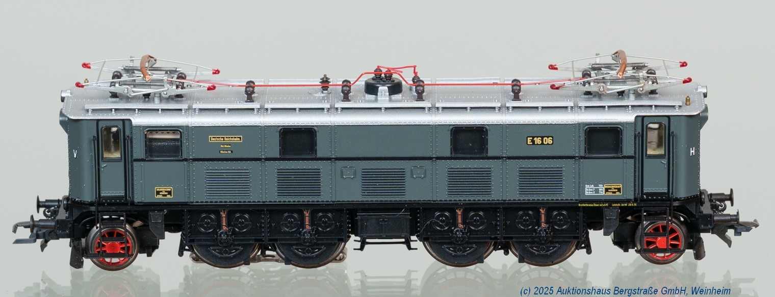 1445 | Tax: 30,- | 1 Märklin Elektrolokomotive 3037, Baureihe: E 41, Deutsche Bundesbahn, Epoche III Betriebsnummer: E 41.024, Achsfolge: 'Bo''Bo', Länge: 17,6 cm, Gehäuse: grün, Dach: silber, drei Stirnlampen an jeder Front, Fenster mit Cellonscheiben hinterlegt, Bauzeit: 1960-68, vernickelte Pantographen, geringe Gebrauchsspuren, noch guter Zustand, Originalkarton! | |