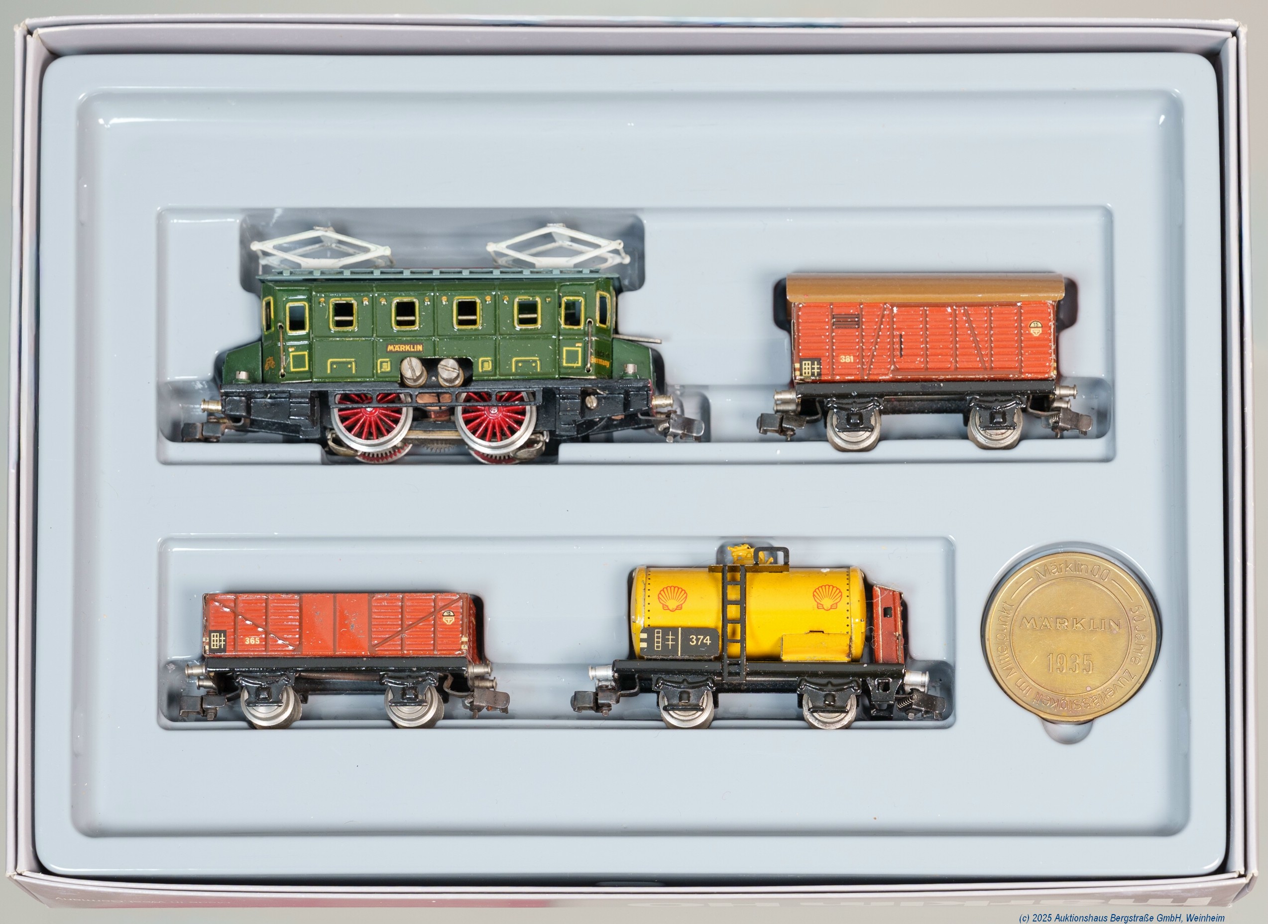 1494 | Tax: 500,- | 1 Märklin Güterzug: Elektrolokomotive RS 700, Achsfolge: 'B', Länge: ca. 13 cm, Gehäuse: grün, Dach: grau, statisch Pantographen, Fensterstege im Maschinenraum, 1 Kesselwagen 374, 'Shell', 1 Hochbordwagen 365 und 1 Gedeckter Güterwagen 381, alle mit brünierter Klauenkupplung, A C H T U N G! es handelt sich um Originale von 1935/36 in der Verpackung der Neuauflage 0050, einige Gebrauchsspuren, noch guter Zustand, bitte besichtigen, Teil-Originalkarton 0050!! | |