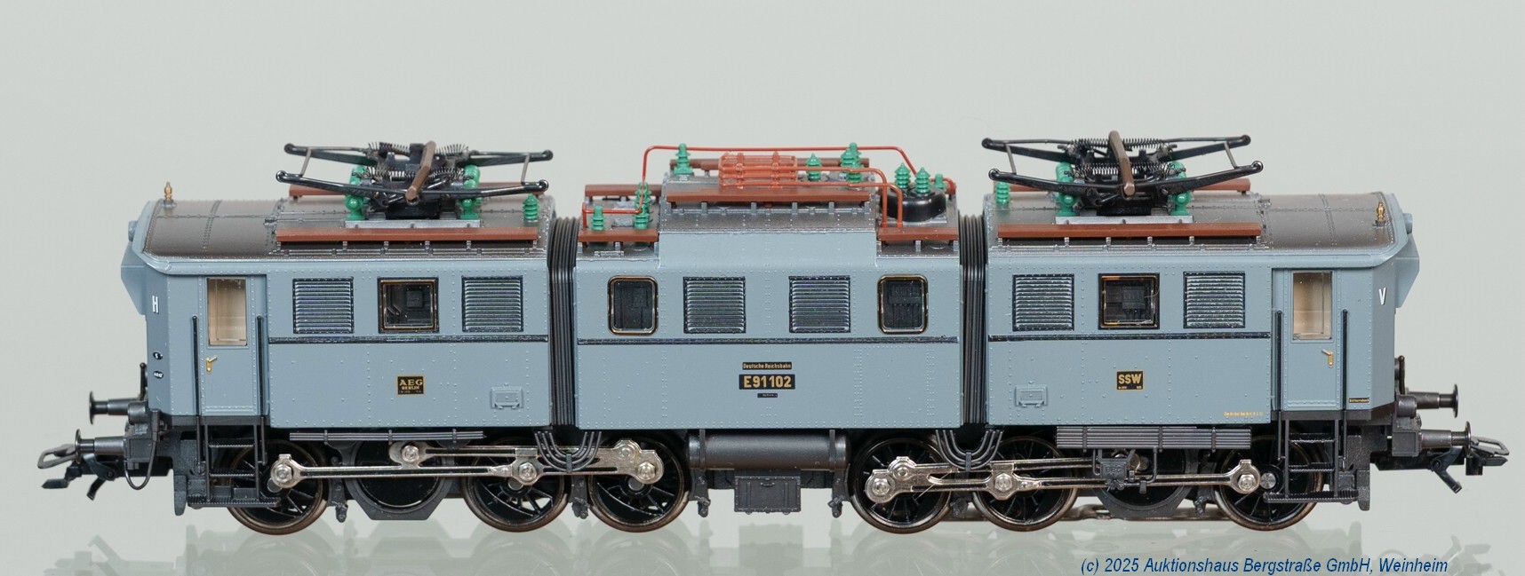 1525 | Tax: 64,- | 1 Märklin dreiteilige Elektrolokomotive 3528, Baureihe: E 91, Deutsche Reichsbahn Gesellschaft, Epoche II, Betriebsnummer: E 91.102, Achsfolge: 'C''C', Länge: ca. 19,8 cm, Gehäuse: grau, sehr guter Zustand, Originalkarton! | |