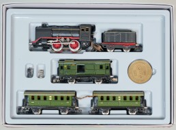1493 | Tax: 450,- | 1 Märklin Personenzug: Dampflokomotive mit 2-achs. Tender, R 700, Achsfolge: 'B', Länge: ca. 20,8 cm, Gehäuse: schwarz/rot, 2 Personenwagen 327 und 1 Packwagen 328, brünierte Klauenkupplung, A C H T U N G! es handelt sich um Originale von 1935/36 in der Verpackung der Neuauflage 0050, Beschriftung abgegriffen, einige Gebrauchsspuren, noch guter Zustand, bitte besichtigen, Teil-Originalkarton 0050!! | |
