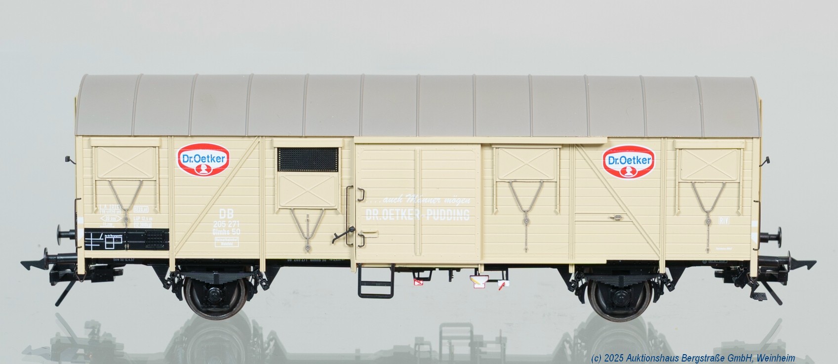 | 3004 | Tax: 60,- | 1 MBW Spur 0 Gedeckter Privat-Güterwagen 80228, 2-achs., Deutsche Bundesbahn, Epoche III, Bauart: Glmhs50, Wagennummer: 205.271, cremeweiß, Aufschrift: 'DR. Oetker Pudding', Bretterwände, Lenzkupplungen, Metallradsätze, neuwertig, Originalkarton! | |