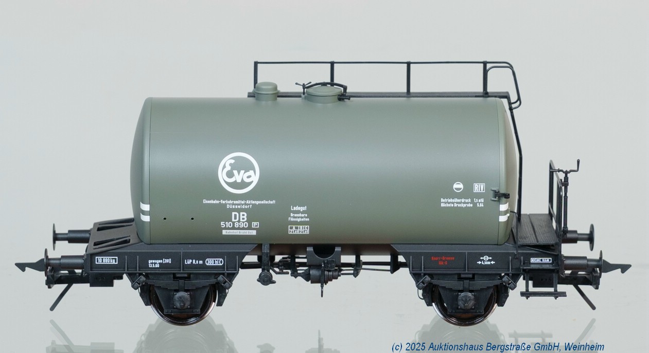 | 3003 | Tax: 70,- | 1 MBW Druckgaskesselwagen 80507, 4-achs., Deutsche Bundesbahn, Epoche III, Wagennummer: 541.212, Kessel: grau, Aufschrift: 'EVA', Rahmen: schwarz, absolut neuwertig, Originalkarton! | |