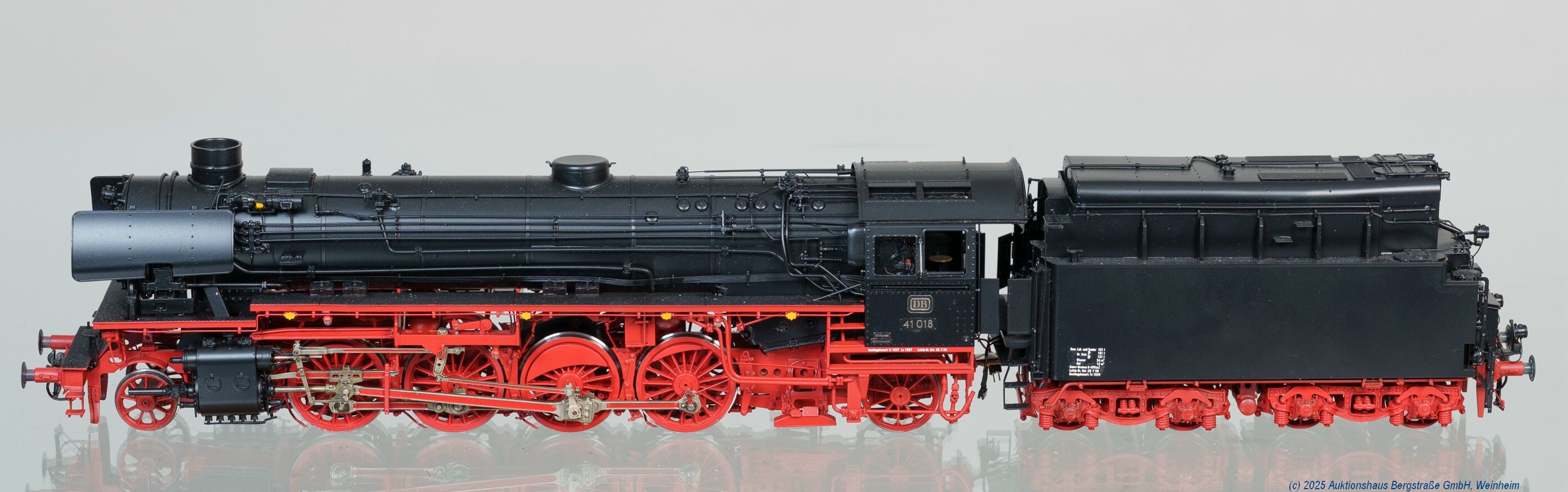 | 3047 | Tax: 1300,- | 1 Gehbauer Spur 0 Dampflokomotive mit 4-achs. Öl-Tender 41.018, Kleinserien Metallmodell, Deutsche Bundesbahn, Epoche III, Betriebsnummer: 41.018, Achsfolge: 1'D'1, vordere Rangiergriffstangen liegen im Beutel bei, sonst neuwertig, stabiler hölzerner Transportkoffer, nur an Selbstabholer! | |