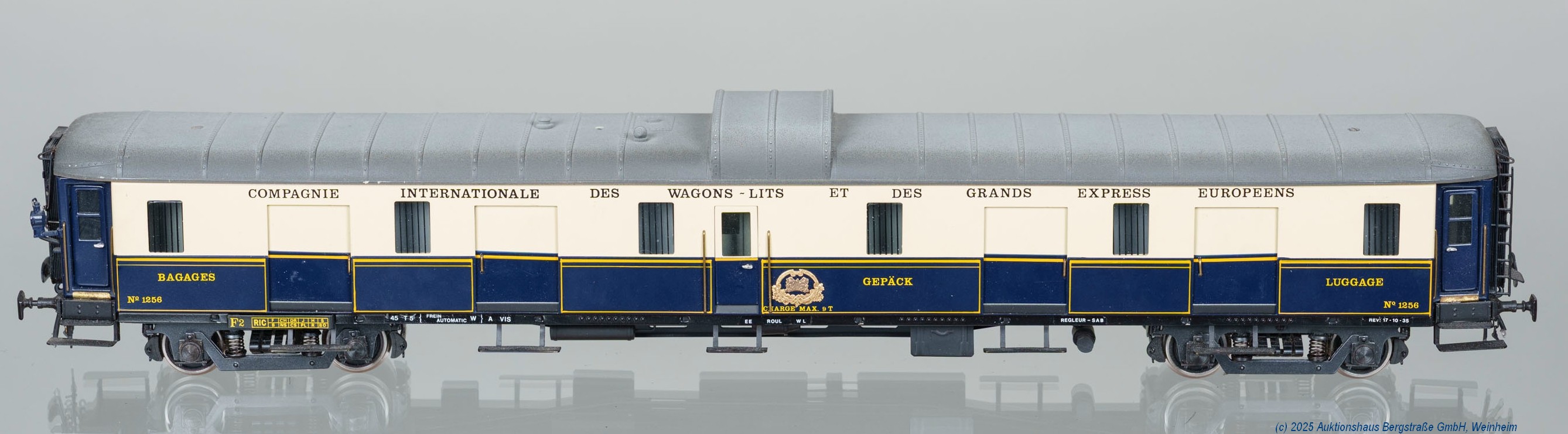 | 3048 | Tax: 240,- | 1 Elletren/Fulgurex Spur 0 Packwagen, 4-achs., mittige Zugführerkanzel, CIWL, Epoche II/III, Wagennummer: 1256, Länge: ca. 55 cm, dunkelblau/cremefarben, Dach: grau, Federpuffer, Vorbildkupplungen, Metallradsätze, Schlusslaterne, hochfeine Metallausführung, sehr guter Zustand! | |