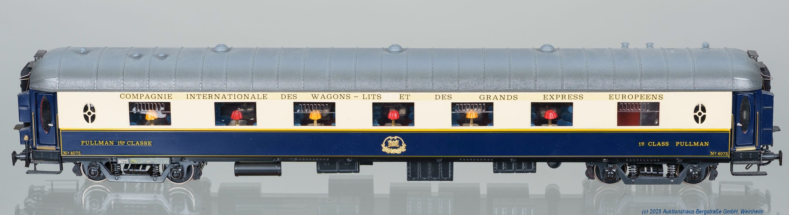 | 3051 | Tax: 230,- | 1 Elletren/Fulgurex Spur 0 Pullmanwagen, 4-achs., CIWL, Epoche II/III, 2.Klasse, Wagennummer: 4127, Länge: ca. 55 cm, dunkelblau/cremefarben, Dach: grau, Inneneinrichtung, Federpuffer, Vorbildkupplungen, Metallradsätze, hochfeine Metallausführung, sehr guter Zustand, Originalkarton! | |