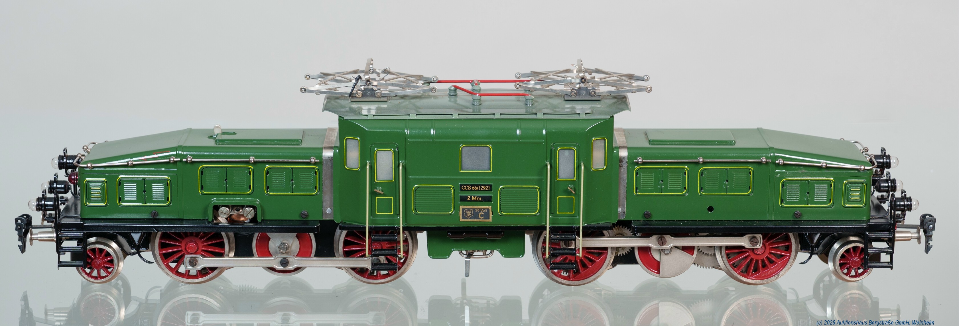 7000 Tax: 2700,-1 Thul Spur I Märklin Replika 'Krokodil' CCS 66/12921, Länge: ca. 63 cm, 20 Volt Ausführung, 2-motorig, je drei Spitzenlichter und 1 rotes Schlusslicht an den Fronten, dunkelgrün, Dach: Dach: grau, zwei bewegliche Pantographen, 2 bewegliche Angeltüren auf jeder Seite des Führerstandes, Federpuffer, neuwertiger Zustand, massive Holzkiste, nur an Selbstabholer!
