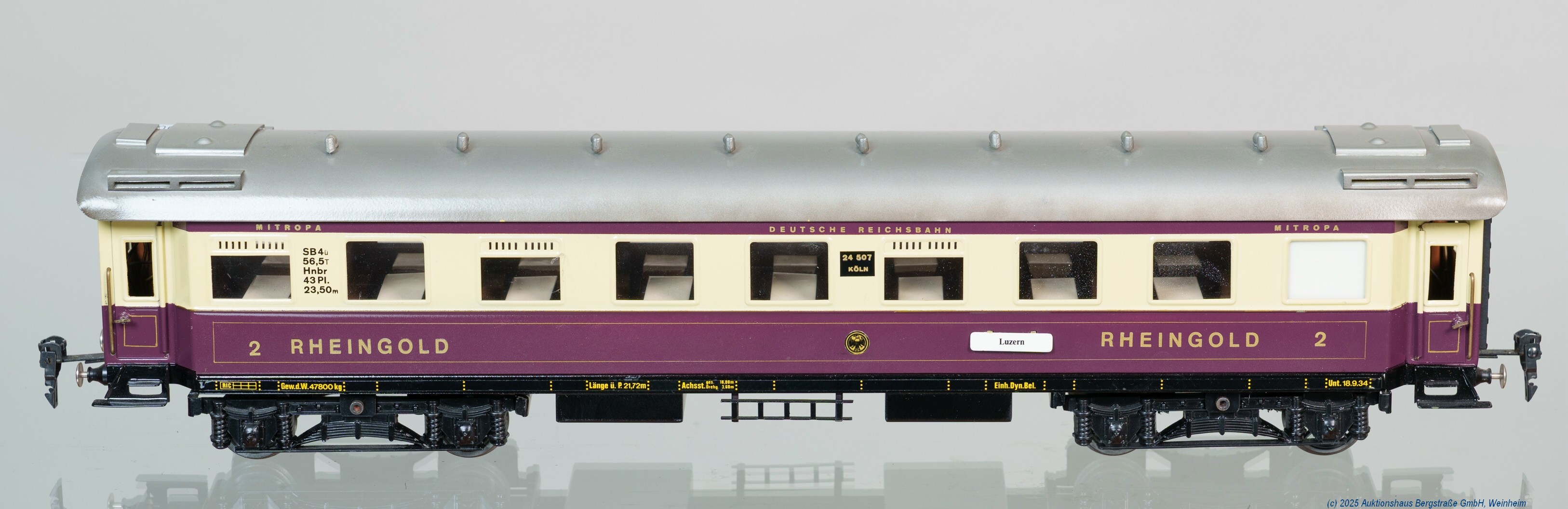 7005 Tax: 160,-1 Wilag/Märklin Spur I 'RHEINGOLD'-Salonwagen, 4-achs., vier Angeltüren zum Öffnen, Tonnendach mit 8 imit. Dachlüftern, Länge: ca. 57 cm, Gehäuse: Violett/creme, Aufschrift: 'RHEINGOLD' 'Deutsche Reichsbahn', Dach: silberfarben, seitlich schattiert, Inneneinrichtung, Innenbeleuchtung, Federpuffer, massive Speichenräder, Rahmenbeschriftung, zusätzlich angesteckte Märklin Schlusslichter, zwei kleine Schrauben im Dach, sonst sehr guter Zustand, nur an Selbstabholer!