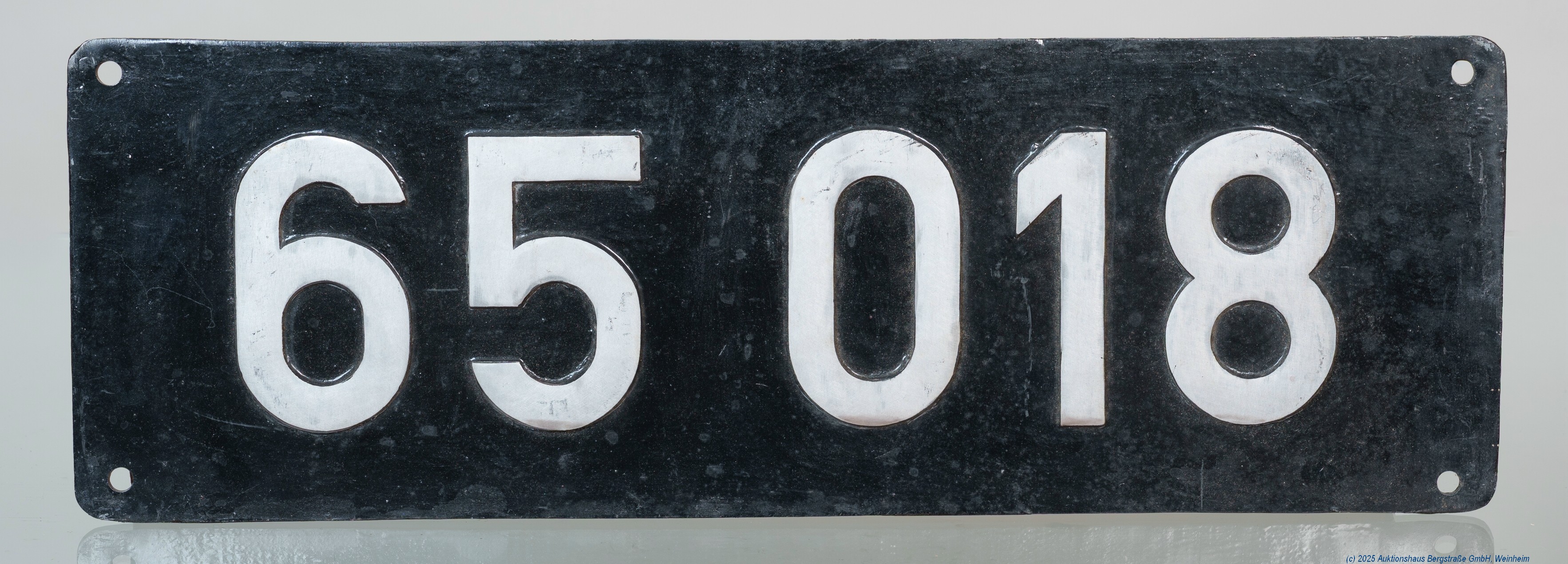 | 6022 | Tax: 40,- | 1 Lokomotivnummernschild: '65.018' Typographie DB, Epoche III, Aluminium-Guss, möglicherweise Original, überlackiert, 60 cm x 20 cm, leichte Gebrauchsspuren, noch guter Zustand, bitte besichtigen! | |